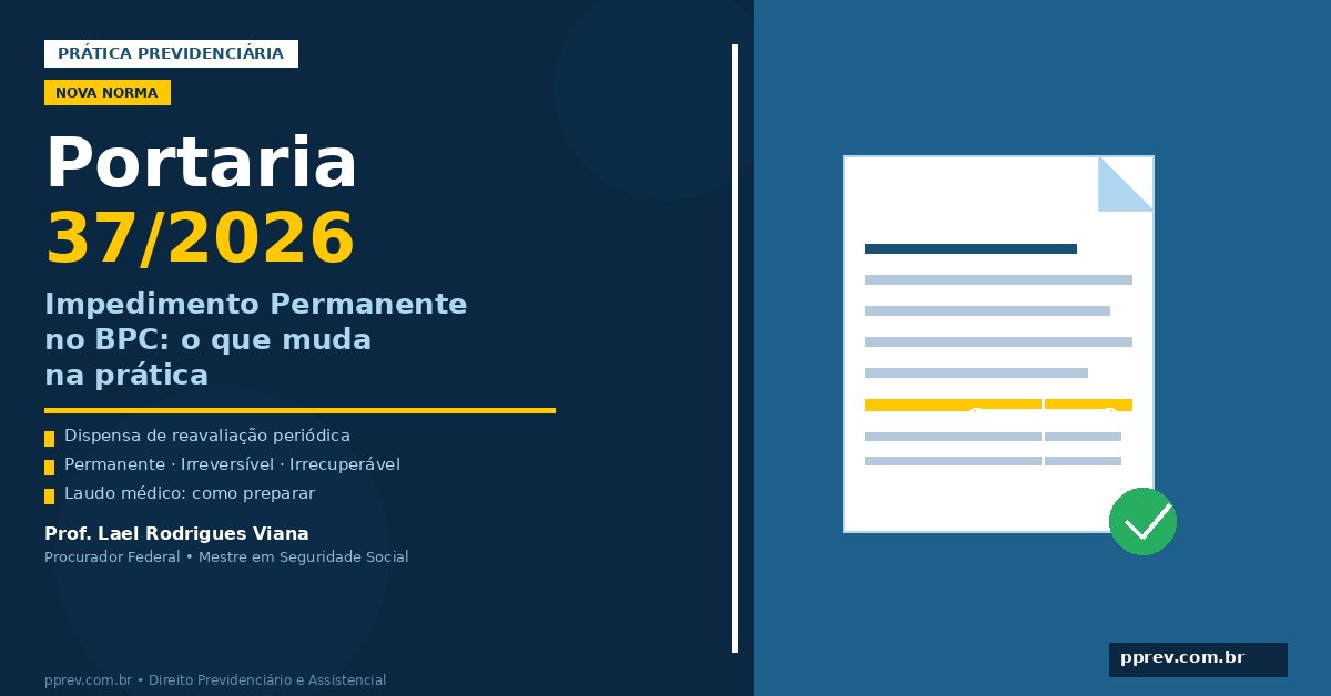 VIANA, Lael Rodrigues. Portaria 37/2026: impedimento permanente no BPC — o que muda na prática. Prática Previdenciária (pprev.com.br), 8 abr. 2026.